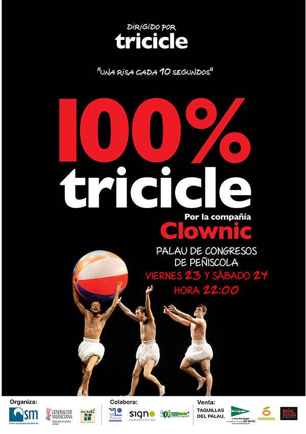 100% Tricicle es una antología de los mejores momentos de los 7 espectáculos que ha credo Tricicle: MANICOMIC, EXIT, SLASTIC, TERRRIFIC, ENTRETRES, SIT y un pequeño avance de la nueva creación GARRICK, interpretados por la compañía Clownic y dirigidos por TRICICLE.