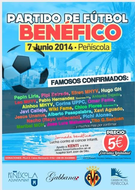 Peñíscola acogerá el próximo sábado día 7 de junio un partido de fútbol benéfico en en el campo municipal Benedicto XIII a partir de las siete de la tarde. El objetivo es recaudar fondos que irán destinados a la investigación del cáncer infantil del hospital Sant Joan de Déu de Barcelona. En el partido participaran numerosos famosos participantes de programas televisivos o deportistas profesionales.